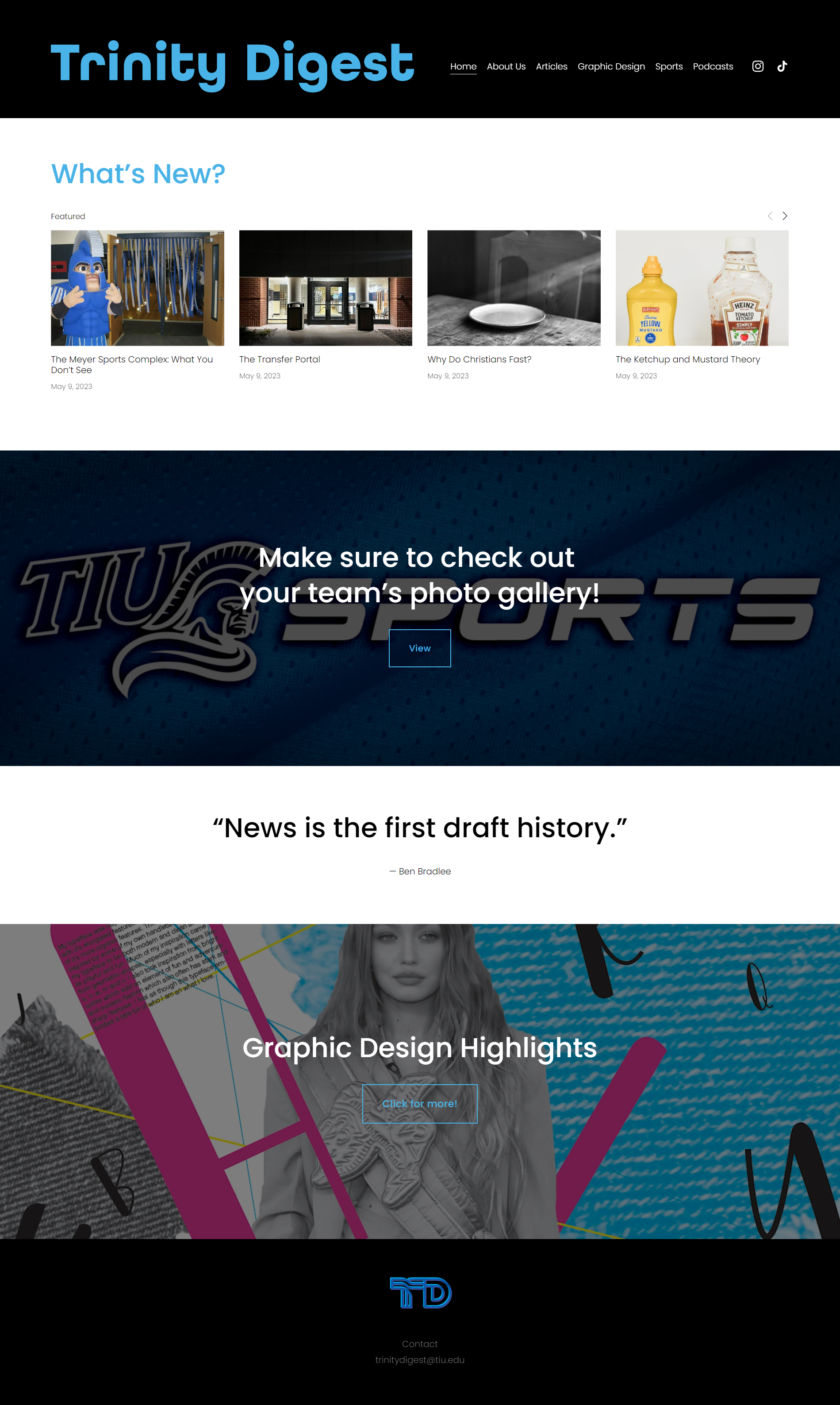 The Trinity Digest was Trinity International University's student-run newsletter. I was a part of the team that updated the website and raised awareness of the newsletter, using my design skills to create a flyer to advertise it, as well as revamping the website and its visual style after its move from WordPress to Squarespace.